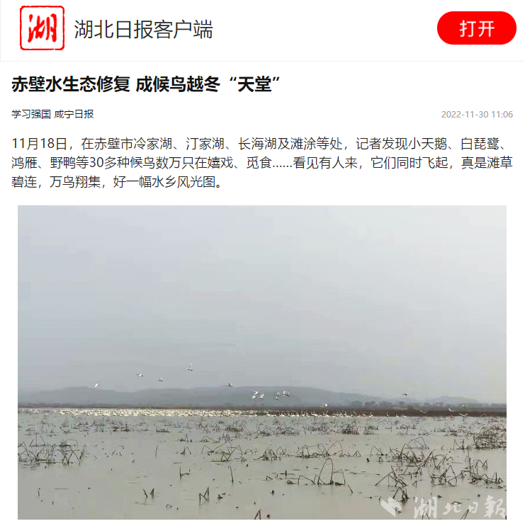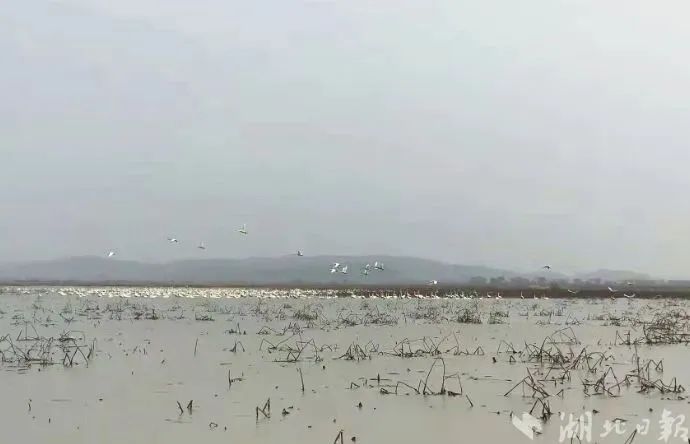 當(dāng)天,咸寧市生態(tài)環(huán)境局赤壁分局工作人員在黃蓋湖赤壁市境內(nèi)西部、北部淺水區(qū)水生態(tài)環(huán)境修復(fù)工程完工驗(yàn)收,候鳥(niǎo)云集,給了工作人員最好的“生態(tài)答卷”。